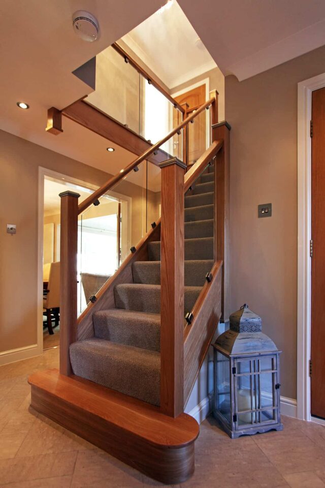We were contacted by our client to install this magnificent contemporary oak and glass balustrade. The Staircase fitted in seamlessly and was the perfect match for the recently installed oak doors. Finishing with a beautifully handcrafted feature step.